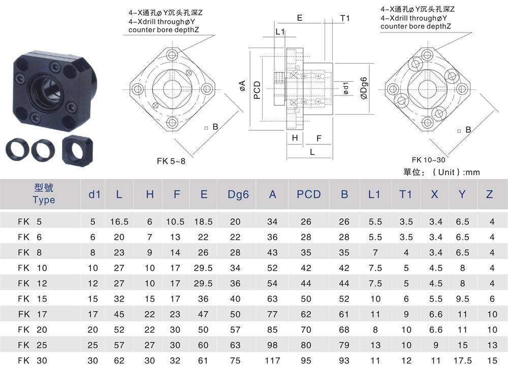 FK絲桿支撐座簡單的來講是連接絲桿和電機的軸承固定底座,是正確的標準滾珠螺桿軸端成品,同時預備了四種種標準化的支撐單元:EK型、EF型和BK型、BF型。支撐單元固定側的裝有經過預壓調整的JIS5級的角接觸球軸承,很多都是小型的,特別是在EK6、EK8兩種超小型式中,則裝有為超小型滾珠螺桿所開發設計的接觸角45°(45度)的超小型角接觸球軸承,為了能獲得高精度、高剛性并且穩定自如的回轉性能,同時支撐座的支撐單元也使用了深溝球軸承,支撐單元BK型、EK型的內部軸承中裝入了適當的鋰皂基潤滑脂,不易過多,用特殊密封墊圈進行密封,可以長期使用,也能直接安裝。