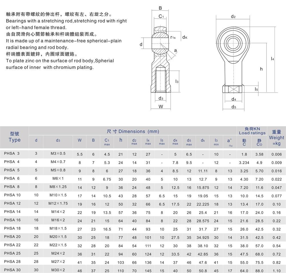 PHSA內螺紋自潤滑桿端關節軸承是關節軸承中的一個支類,是帶有裝于桿端關節軸承,關節軸承的意思就是球面滑動軸承,具有球形滑動球面接觸表面的內、外圈組成基本型關節軸承,能承受很大的負荷,在工作中不易損壞。復合材料是鑲在內圈的外球面上,在工作中關節軸承可以產生自潤滑,其作用是用于速度較低的滑動運動和擺動運動,同時可以在一定角度范圍內進行傾斜運動,自潤滑關節輔承一般應用于水利工業、專業機械等行業領域,軸殼孔和支撐軸其心度較大時,依然可以進行正常工作,為什么會這樣,因為關節軸承傾斜角度大,其球形滑動時,接觸面積也大,所以大多數關節軸承采用了特殊的工藝處理方法,好應用于一些重要場合。